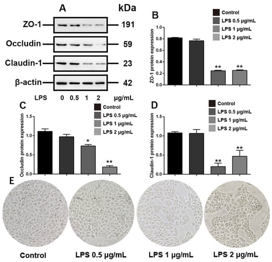 LPS is commonly used as an inflammatory-mimetic agent. We aimed to assess tight junction disruption induced by LPS-mediated inflammation in IPEC-J2 cells. We initially set three doses to determine the LPS concentration required to cause significant damage to the tight junctions of IPEC-J2 cells. The results showed that LPS at doses below 1 µg/mL for 48 h did not significantly reduce the expression of the tight junction proteins ZO-1, occludin, and claudin-1 (p > 0.05) and 2 μg/mL LPS showed more obvious inhibitory effects on the expression of occludin (p < 0.01) (Figure 1A–D). In addition, discrete cell arrangement and more cell gaps were observed in IPEC-J2 treated with 2 μg/mL LPS (Figure 1E). These results indicated that LPS with a concentration of 2 μg/mL can induce obvious tight junction disruption of IPEC-J2 cells.