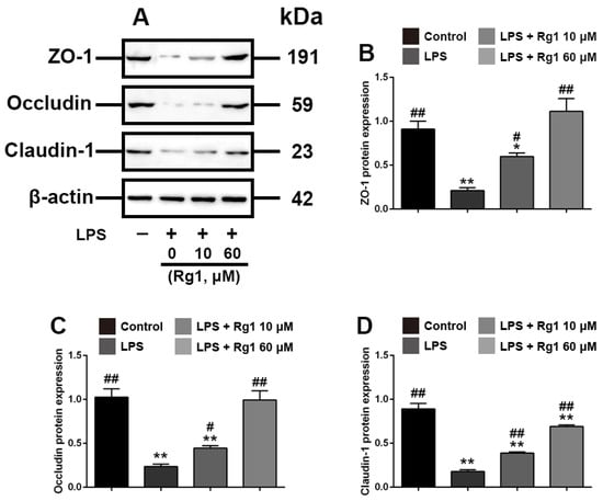 Rg1 inhibits LPS-induced tight junction disruption in IPEC-J2 cells in vitro. IPEC-J2 cells were treated with vehicle, Rg1 or LPS at the indicated concentrations for 48 h. (A) Western blot analyses of tight-junction-related proteins; effect of Rg1 on ZO-1 (B), occludin (C) and claudin-1 (D) in IPEC-J2 cells. β-Actin was used as an invariant control for equal loading. Blots are representative of three independent experiments with densitometry, showing the mean ± s.d. * p < 0.05 versus control and ** p < 0.01 versus control. # p < 0.05 versus LPS and ## p < 0.01 versus LPS.