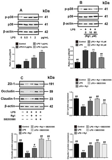 Interference with p38 MAPK signaling is associated with Rg1 inhibition of LPS-induced tight junction disruption in IPEC-J2 cells in vitro. IPEC-J2 cells were treated with vehicle and LPS at the indicated concentrations for 48 h. (A) Western blot analyses of p38 MAPK signaling molecules. IPEC-J2 cells were treated with vehicle, LPS (2 μg/mL) and Rg1 at the indicated concentrations for 48 h; (B) Western blot analyses of p38 MAPK signaling molecules. IPEC-J2 cells were treated with vehicle, LPS (2 μg/mL), SB203580 (10 μM), and Rg1 (60 μM) for 48 h; (C) Western blot analyses of tight-junction-related proteins. β-Actin was used as an invariant control for equal loading. Blots are representative of three independent experiments with densitometry showing the mean ± s.d. * p < 0.05 versus control and ** p < 0.01 versus control. # p < 0.05 versus LPS and ## p < 0.01 versus LPS.