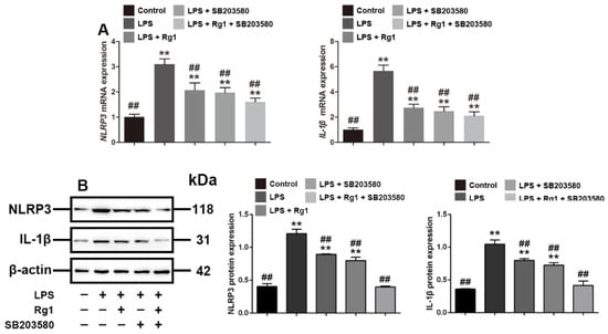 To verify that Rg1 reversed LPS-induced tight junction disruption through p38 MAPK signaling, we evaluated the effects of Rg1 and SB203580 on NLRP3 and IL-1β, which belong to the downstream proteins of p38 MAPK signaling, as demonstrated previously [,]. The Q-PCR and Western blot results showed (Figure 4) that LPS significantly enhanced the mRNA and protein expression of NLRP3 and IL-1β, while Rg1 treatment significantly reversed the increased expression (p < 0.01). We further used SB203580 to verify that the expression of NLRP3 and IL-1β is associated with p38 MAPK signaling, and the result showed that Rg1 had a similar effect with SB203580 in reducing the expression of NLRP3 and IL-1β by inhibiting p38 MAPK signaling.