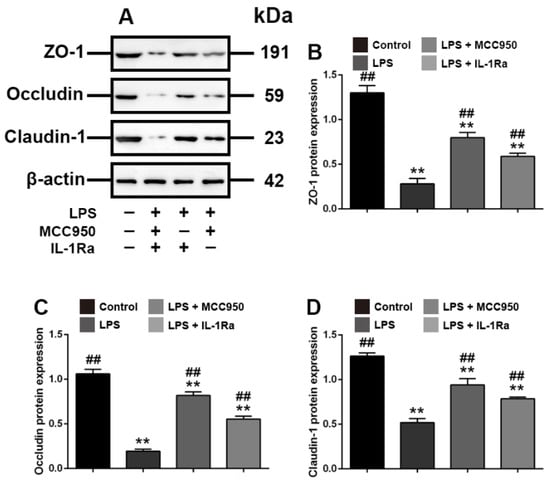Interference with NLRP3 and IL-1β is associated with tight junction in IPEC-J2 cells in vitro. PEC-J2 cells were treated with vehicle, LPS (2 μg/mL), MCC950 (10 μm) and IL-1Ra (10 ng/mL) for 48 h. Western blot analyses of tight-junction-related proteins. (A) Western blot analyses of tight-junction-related proteins; effect of LPS on ZO-1 (B), occludin (C) and claudin-1 (D) in IPEC-2 cells. β-Actin was used as an invariant control for equal loading. Blots are representative of three independent experiments with densitometry showing the mean ± s.d. ** p < 0.01 versus control. ## p < 0.01 versus LPS.