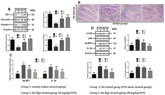 Rg1 inhibits tight junction disruption associated with interference with p38 MAPK signaling in murine intestinal dysfunction caused by LPS. Experimental groups including Group 1, control (saline-treated group); Group 2, the model group (LPS-alone-treated group); Group 3, the Rg1-treated group (10 mg/kg + LPS); and Group 4, the Rg1-treated group (20 mg/kg + LPS). Ileum sections were stained with HE for histological assessment. (A) Representative views are shown (original magnification × 20); (B) Western blot analyses of tight-junction-related proteins. Western blot analyses of tight-junction-related proteins; (C) mRNA level analyses of NLRP3 and IL-1β; (D) Western blot analyses of p38 MAPK signaling-related proteins. β-Actin was used as an invariant control for equal loading. Blots are representative of three independent experiments with densitometry showing the mean ± s.d. * p < 0.05 versus control and ** p < 0.01 versus control. ## p < 0.01 versus LPS.