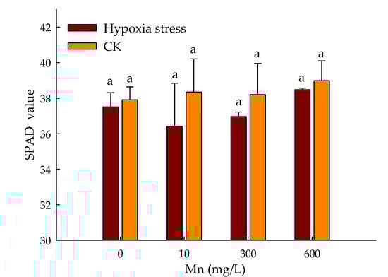 Changes of SPAD values in leaves of P. praecox treated with different Mn concentration under hypoxia stress. Data points and error bars represent mean ± S.D. of three replicates (n = 3). Different letters indicate significant difference (p < 0.05).