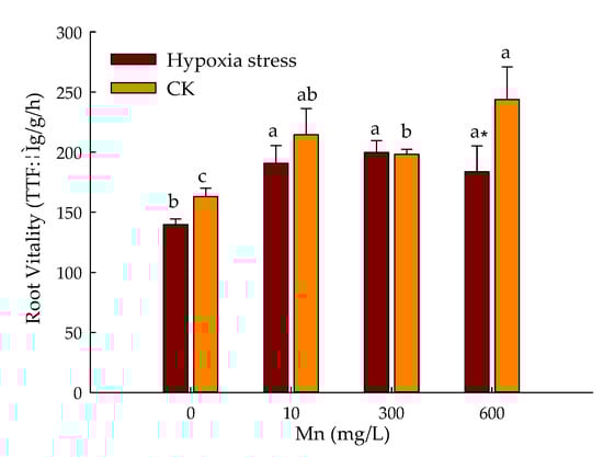The root system is very crucial for the absorption and utilization of water and nutrients by plants. The length, surface area, average diameter, volume, and tips of roots reflect the degree of root development []. The high rhizosphere had dissolved oxygen content (8.0–9.0 mg/L), promoting root growth and development in the split-root system []. In this study, the condition of hypoxia had significantly decreased indexes of plants than ventilation treatment. This is due to inhibition of aerobic respiration of plant cells with an environment of hypoxia, which produced an underdeveloped root system. Coarser and shorter rice roots grown in an environment of poor ventilation was reported by previous study []. This is probably due to the adaptive mechanism of root systems to hypoxia []. The addition of Mn can obviously improve root growth, promoting the elongation, volume, surface area, and number of root tips, but reducing root diameter due to the stresses of hypoxia. The application of Mn could promote root growth via enhancing the absorption of water and nutrients. The root system is an important organ for plant absorption and metabolism. Growth and development of roots directly affects the growth of shoots and leaves. The root activity is a comprehensive index reflecting root absorption function []. In this study, the root activity of P. praecox was reduced due to stresses of hypoxia, which indicated its damage to the root system. Higher root activity is beneficial to maintain function of the root system and plant growth, and to enhance plant resistance during condition of adversity []. In this study, 300 μmol/L Mn2+ treatment increased the root activity of plants, and but decreased root activity with high concentrations. This may be due to the improved resistance of P. praecox to hypoxic stress with application of 300 μmol/L Mn2+. The Mn2+ concentration ranged between 10 and 200 M, which had an improved variability of the root cell, but reversely, the high level of Mn2+ aggravated the existing damage to seedlings of tomato [].