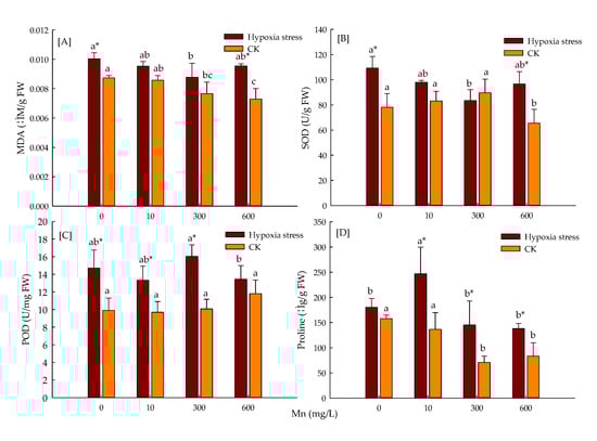 Proline will accumulate in plants in adverse environments. The content of proline in plants reflects the tolerance of plants to adversity in some extent []. It has been reported that proline was accumulated in plant cells due to hypoxia conditions, while the content of proline was lower due to treatment of aeration []. In this study, hypoxia has enhanced accumulation of proline in plants, while high levels of Mn have reduced the content of proline, indicating that increases of Mn protect plant cells from oxidative damage.