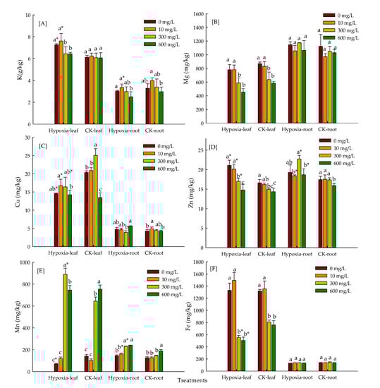 Roots and leaves were dried at 70 °C for 72 h. The oven-dried plant parts were passed through a 0.1 mm nylon sieve for K, Mg, Cu, Zn, Mn, and Fe analysis. Approximately 0.3 g of roots or leaves was digested in the HNO3/HClO4 solution and fixed the volume to 50 mL with de-ionized water. The digested solution was washed in 50 mL flasks and volume was made using de-ionized water. The supernatant was analyzed by flame atomic absorption spectrometry (FAAS, PerkinElmer AA800, Los Angeles, CA, USA).