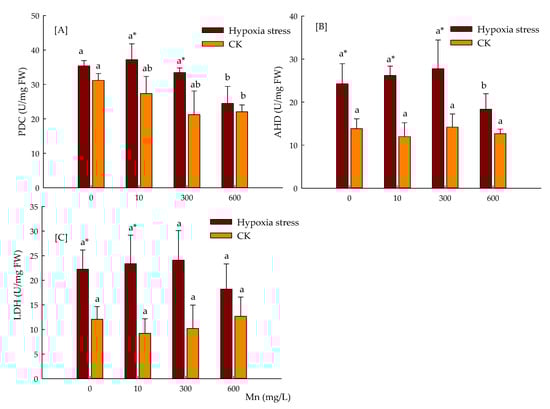 Figure 5 reveals the higher activity of PDC, LDH, and ADH than CK in hypoxia stress. The PDC, LDH, and ADH activity was initially enhanced and then fell with increases of Mn2+. The maximum value of improvement in PDC activity was 5.09% with application of 10 μmol/L Mn2+; LDH and ADH activity with an application of 300 μmol/L Mn2+ was 14.42 and 8.24%, respectively. The minimum value of decrease in enzyme activities was observed under 600 μmol/L Mn2+ stress, which were reduced by 30.74, 24.47, and 18.10%, respectively, compared to without Mn in CK conditions. The PDC activity declined with the increase of Mn2+. The LDH and ADH activity were not changed significantly.