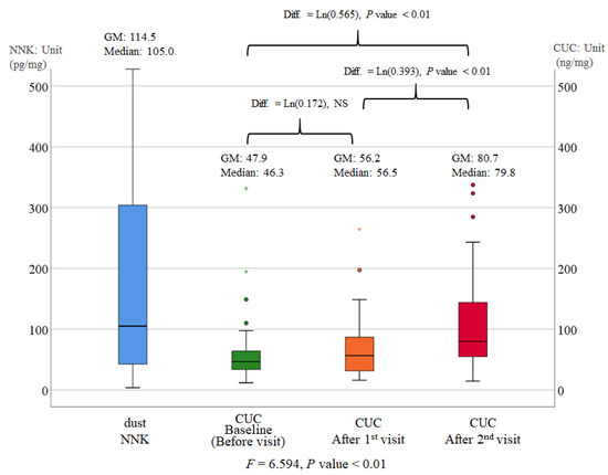 The geometric mean (GM) dust NNK concentration was 114.5 pg/mg (median: 105.0 pg/mg). The GM CUC concentration increased across the time points, from 47.9 ng/mg (median: 46.3 ng/mg) at the baseline to 56.2 ng/mg (median: 56.5 ng/mg) at the first visit and 80.7 ng/mg (median: 79.8 ng/mg) at the second visit (Figure 1).