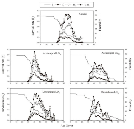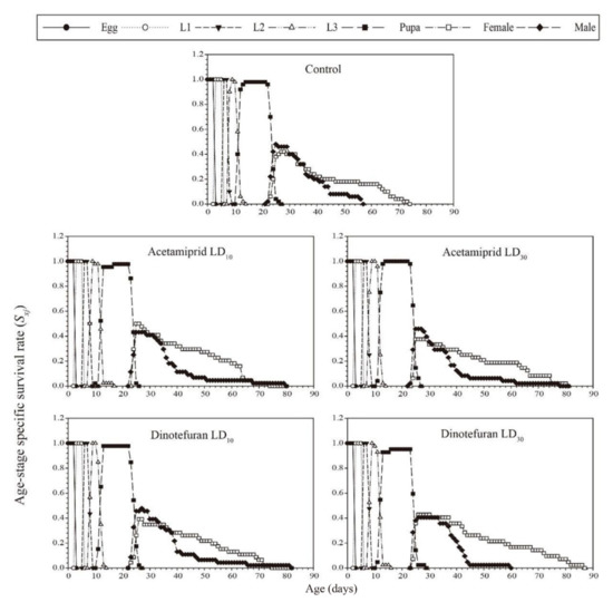 The age-stage-specific survival rate (Sxj) curve is shown in Figure 1. The results showed that the peak survival rates of females and males in the control group were 42% and 48%, respectively. The peak survival rates for the acetamiprid (i.e., LD10: 50% for females and 43.2% for males; LD30: 37.5% for females and 45.8% for males) and dinotefuran (i.e., LD10: 39.1% for females and 45.7% for males; LD30: 42.9% for females and 40.5% for males) treatment groups were similar to the control.