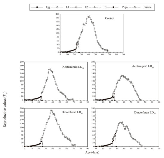 The age-stage-specific reproductive value (vxj) curves are the contribution of each individual to the future reproduction of the entire population at stage j of age x. vxj curves of two pesticides at sublethal doses are shown in Figure 3. These results indicated that the effects of acetamiprid and dinotefuran on C. pallens reproductive value increased significantly with an increase in dosage. The highest peak for the controls occurred on the 42nd day (191.93 day−1). However, the highest peaks in the treatments of acetamiprid at LD10 and LD30 occurred on the 37th day (162.06 day−1) and 37th day (128.46 day−1), respectively. The corresponding values for dinotefuran treatments at LD10 and LD30 were 189.84 day−1 (occurred on the 38th day) and 127.22 day−1 (occurred on the 35th day), respectively.