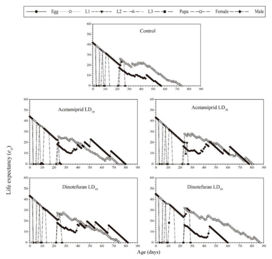 The age-stage-specific life expectancy (exj) is defined as the number of days that individuals of age x and stage j can continue to live. The results of exj are shown in Figure 4. The exj values of C. pallens treated with acetamiprid at LD10 and LD30 were 42.20 and 43.19 days, respectively. The corresponding values for dinotefuran treatment at LD10 and LD30 were 43.46 and 45.05, respectively, while the value for the control group was 41.88 days.