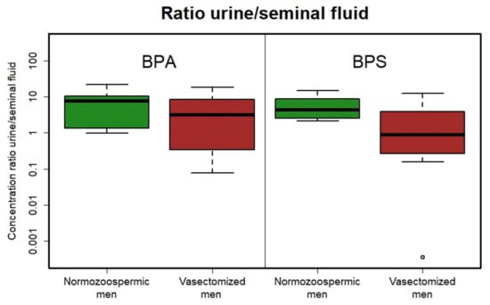 Several authors have mentioned bisphenol transport primary via the blood–testis barrier in the testes []. In our study we did not find any differences in bisphenol urinal/seminal ratio in normozoospermic men and men after vasectomy (which ejaculate is without testicular products). This study, focused on detection of bisphenols in urine and seminal plasma, clearly demonstrated that the pathway for bisphenols to seminal plasma is not primarily via testicular tissue and that these substances are much more transported together with secrets of accessory glands (prostate, seminal vesicles and bulbourethral glands) that produce more than 95% of the human ejaculate volume. Our results suggest even the opposite trend, i.e., higher levels of bisphenols in seminal plasma than in urine in men after vasectomy in comparison with the control group. This is probably caused by a small set of patients with high individual differences. Indeed, in urine, total BPA was detected (i.e., also after metabolization), while only free BPA was detected in seminal plasma. Detection of multiple extreme values of the ratio of urinal/seminal bisphenols is observed in the group after vasectomy more often than in normozoospermic patients (Figure 1). This is probably due to the large dispersion of values and partly the role of chance. In this vasectomized men, we would expect there to be less bisphenols in ejaculate than urine and the urinal/seminal ratio would increase. However, we observe extreme values only in the opposite direction, i.e., higher concentrations of bisphenols in seminal plasma compared to urine. The final proportion of bisphenols contents in urine and seminal plasma can be affected by time of exposition or entrance of bisphenols to the organism. As mentioned before, there are two different biotransformation ways after per oral or transdermal exposition.