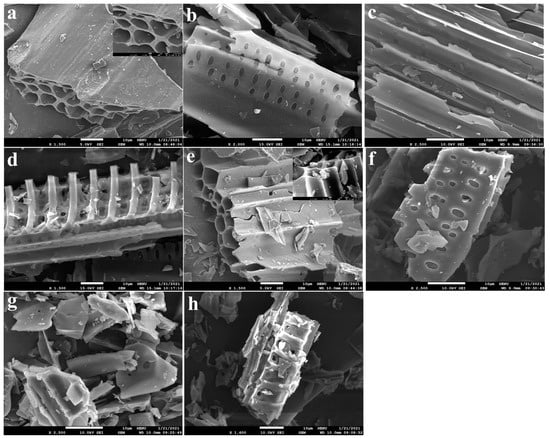 The morphological structures of BC and HNC are shown in Figure 1. The structure of BC is tube-shaped, sieve-pored, layered and skeleton-like (Figure 1a–d), which is relatively complete. Conversely, the layered structure was broken (Figure 1e), and the tube-shaped, sieve-pored and skeleton-like structure was collapsed after the modification (Figure 1f–h). In addition, the pore size of HNC was larger than that of the BC, and the average pore diameter increased from 10.20 to 13.46 nm. Compared with BC, the specific surface area, pore volume and micropore volume of NHC all decreased obviously (Table 1). The element analysis indicated that the C content of BC decreased dramatically from 76.29% to 57.55% after the modification. Correspondingly, the content of H, O and N increased from 3.88%, 18.38% and 0.51% to 6.26%, 27.52% and 4.44%, respectively. The atomic ratios of H/C, O/C and (O+N)/C were 0.05, 0.24 and 0.25 for BC, which were increased to 0.11, 0.48 and 0.56, respectively, of that of the HNC. These results indicate that HNC had stronger hydrophilicity and greater polarity, and the aromaticity was weakened [,], which may be more conducive for the adsorption of metals [].