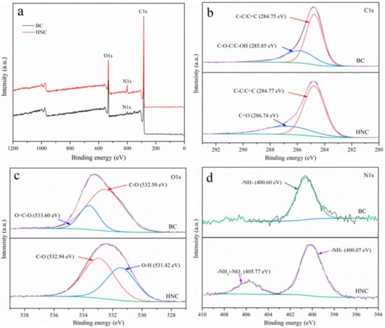 As shown in Figure 2a, the peaks that appeared at binding energies of 284.75, 532.5 and 400.60 eV can be assigned to C1s, O1s and N1s, respectively. The C1s (Figure 2b) peak can be divided into four components: 284.75 eV (C−C/C=C) and 285.85 eV (C−O−C/C=OH) in BC and 284.77 eV (C−C/C=C) and 286.74 eV (C=O) in HNC []. The O1s spectra (Figure 2c) displayed two peaks: 532.50 eV (C–O) and 533.60 eV (O–C–O) in BC and 531.42 eV (O–H) and 532.94 eV(C–O) in HNC []. Moreover, the N1s peaks (Figure 2d) displayed 400.60 eV (−NH−) in BC and 400.07 (−NH−) and 405.77 eV in HNC (−NH2/−NO2) []. The atomic% of N1s increased from 0.68% to 5.78% after the modification, and the new peaks also appeared in the N1s spectrum at about 405.77 eV, which confirmed that aminos were successfully grafted on HNC.
