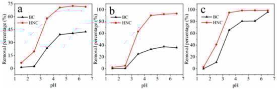 The effects of initial pH (1.5–6.5) on the removal of Cu2+, Cd2+ and Pb2+ by BC and HNC are shown in Figure 3. The removal percentage of Cu2+, Cd2+ and Pb2+ was the lowest at the pH of 1.5, which can be attributed to the fact that the initial pH is lower than the pHpzc of BC (pHpzc = 4.77) and HNC (pHpzc = 2.69) (Table 1). With increasing of the initial pH from 1.5 to 4.5, the removal percentage of metals by BC and HNC increased from 1.5% and 6.6% to 39.4% and 70.6% for Cu2+, 0.4% and 2.4% to 33.0% and 90.4% for Cd2+ and 0% and 2.7% to 80.6% and 98.6% for Pb2+, respectively. The change of these removal percentages was nonsignificant when the initial pH increased from 4.5 to 6.5, except for Pb at pH 6.5 by BC. These results demonstrate that the initial pH had a significant impact on metals adsorption by BC and HNC.