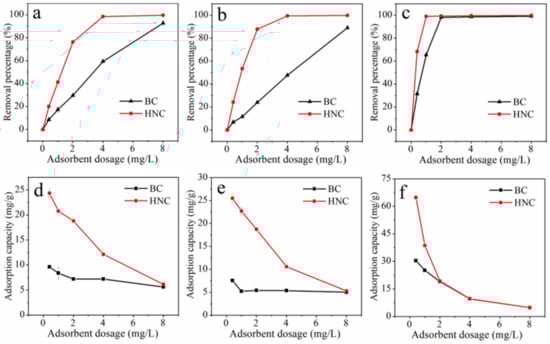 The adsorption of Cu2+, Cd2+ and Pb2+ by different dosages of BC and HNC are shown in Figure 4. When their dosage increased from 0.4 g/L to 8.0 g/L, the removal percentage of these metals by BC and HNC increased from 8.56% and 20.12% to 92.75% and 99.59% for Cu2+, 6.83% and 24.18% to 89.12% and 99.87% for Cd2+ and 31.53% and 68.40% to 99.15% and 99.89% for Pb2+ (Figure 4a–c). In general, the removal percentage of Cu2+, Cd2+ and Pb2+ by BC and HNC increased gradually with the increase of their dosage. In contrast, the adsorption capacity decreased from 9.63 mg/g and 24.34 mg/g to 5.63 mg/g and 6.14 mg/g for Cu2+, 7.56 mg/g and 25.48 mg/g to 5.03 mg/g and 5.31 mg/g for Cd2+ and 30.48 mg/g and 64.84 mg/g to 4.84 mg/g and 4.87 for Pb2+ (Figure 4d–f).