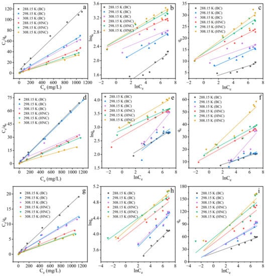 Langmuir, Freundlich and Temkin isotherm fitting of Cu2+ (a–c), Cd2+ (d–f) and Pb2+ (g–i) adsorption by BC and HNC; dosage of 2 g/L (Cu2+, Cd2+) and 1 g/L (Pb2+); pH of 5.5; time of 240 min and temperature of 288.15, 298.15 and 308.15 K.