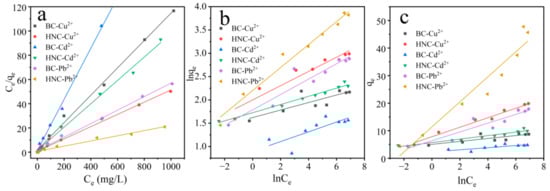 The adsorption isotherms of Cu2+, Cd2+ and Pb2+ by biochar were fitted by Langmuir (Equation (5), Freundlich (Equation (6)) and Temkin (Equation (7)) equations [].