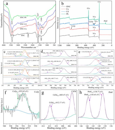Adsorption mechanism for Cu2+, Cd2+ and Pb2+ by HNC. FT-IR spectra (a) and full XPS spectrum (b) of HNC before and after the adsorption of Cu, Cd and Pb; high-resolution XPS spectrum of C1s (c), O1s (d) and N1s (e) of HNC before and after the adsorption of Cu, Cd and Pb; high-resolution XPS spectrum of Cu (f), Cd (g) and Pb (h) after the adsorption by HNC.