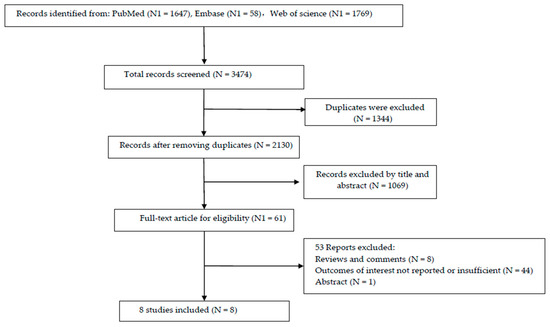 The entire process of the literature collection and screening is illustrated in Figure 1. Based on the search strategy, 3474 articles were identified through database probing. Then, 1344 duplicates were removed, and 2130 articles were excluded after reading the titles or abstracts. Finally, by carefully reviewing the full texts, eight original studies meeting the inclusion criteria were included in the meta-analysis [9,10,11,12,13,18,19,20]. The main features of the included studies in the meta-analysis are shown in Table 1.