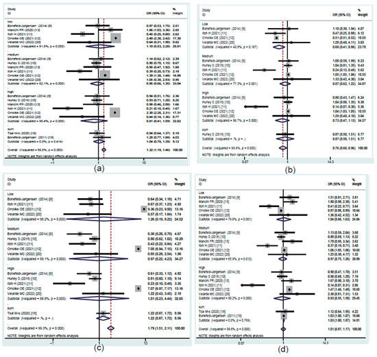 Forest plot of the studies that evaluated the ORs of PFASs. (a) PFOA; (b) PFNA; (c) PFHxS; (d) PFOS.