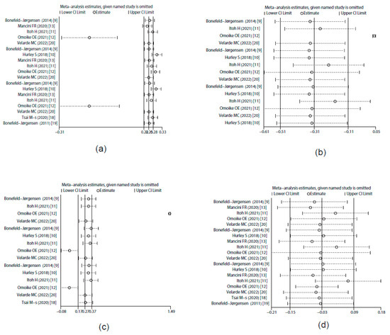 Sensitivity analysis of studies that evaluated the ORs of PFASs. (a) PFOA; (b) PFNA; (c) PFHxS; (d) PFOS.