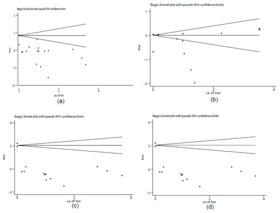 Begg’s funnel plot of publication bias. (a) PFOA; (b) PFNA; (c) PFHxS; (d) PFOS.