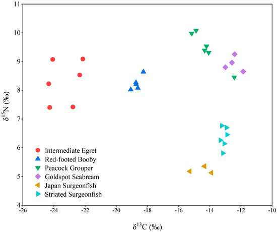 δ13C and δ15N values are often used to infer the carbon source and trophic level in biota [13]. Significant differences for δ13C and δ15N values were observed in biota from Qilianyu Island (p < 0.001). The δ13C values increased the order of intermediate egret (−23.3 ± 0.41‰) < red-footed booby (−18.7 ± 0.13‰) < Japan surgeonfish (−14.5 ± 0.29‰) < peacock grouper (−14.2 ± 0.39‰) < striated surgeonfish (−13.1 ± 0.07‰) < goldspot seabream (−12.5 ± 0.24‰) (Figure 1). The δ13C values of the two bird species were significantly different from the four fish species. Intermediate egret is a migratory and wading bird, mainly feeding on fish, shrimp, frog, locust, aquatic and terrestrial insects, and small invertebrates. The red-footed booby is a resident bird, predominantly feeding on fish, squid, and crustacean and living on the islands [14]. The four fishes live in the sea and feed on marine organisms. Peacock grouper is a carnivorous fish, feeding on small fish and invertebrates. Goldspot seabream also is a carnivorous fish, feeding on polychaetes and shellfish. Japan surgeonfish and striated surgeonfish are herbivorous fish and mainly feed on algae. The results indicated that biota with a more marine feeding strategy have higher δ13C values. The δ15N values decreased in the order of peacock grouper (9.46 ± 0.24‰) > goldspot seabream (8.92 ± 0.13‰) > intermediate egret (8.29 ± 0.31‰) > red-footed booby (8.24 ± 0.11‰) > striated surgeonfish (6.36 ± 0.15‰) > Japan surgeonfish (5.26 ± 0.06‰). The δ15N values of two herbivorous fishes were significantly lower than those of two carnivorous fishes and two bird species, suggesting that the two fishes had a lower trophic level.
