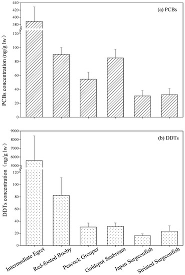 Polychlorinated biphenyls (PCBs) and dichlorodiphenyltrichloroethane (DDT) are two typical types of chlorinated persistent organic pollutants (POPs) and have been of great concern for several decades due to their persistence, toxicity, bioaccumulation and long-range transport. PCBs were mainly used as dielectric and hydraulic fluids in industrial products such as transformers, capacitors, and electric motors from the 1930s to 1970s [1]. DDTs were widely used as an agricultural insecticide in the 1940s and 1950s, and the use of DDTs was prohibited in the early 1970s [2]. It is estimated that China has produced about 10,000 tons of PCBs and 400,000 tons of DDTs [3,4]. Due to the increasing concern about the adverse effects of PCBs and DDTs on wildlife and human health, the production of PCBs and DDTs was banned in the late 1970s and in the mid to late 1980s, respectively. PCBs and DDTs have been added in the initial list of 12 POPs under the Stockholm Convention in May 2001. The production and use of DDTs was prohibited in 2009. However, DDTs are still used in some countries to control certain insects and as antifouling paints for fishing boats [5]. PCBs and DDTs are still slowly and continuously released from old equipment and waste dumps into the environment, which can expose wild animals and humans [6]. PCBs and DDTs can be bioconcentrated into higher trophic levels of biota through the food chain and eventually absorbed by humans, adversely affecting human health [7].