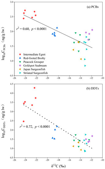 Concentrations of PCBs in bird and fish species from Qilianyu Island ranged from 71.0–519.1 and 6.88–113.2 ng/g lw, respectively. The mean concentrations of PCBs in six biota species had the following order of intermediate egret (416.6 ± 43.6 ng/g lw) > red-footed booby (90.5 ± 11.0 ng/g lw) > goldspot seabream (85.1 ± 12.6 ng/g lw) > peacock grouper (54.7 ± 10.1 ng/g lw) > striated surgeonfish (32.4 ± 9.0 ng/g lw) > Japan surgeonfish (30.6 ± 7.8 ng/g lw) (Figure 2a). Significant differences for PCBs concentrations were found among the six biota species from Qilianyu Island (F = 47.3, p < 0.001). The levels of PCBs in intermediate egret were significantly greater than the other five biota species (p < 0.001), which can be explained by their different feeding and living habits. Intermediate egret is a migratory bird, and the other five biota species often live in the surrounding of Qilianyu Island. In addition, significantly negative relationships between PCBs concentrations and δ13C values were found among the six biota species (Figure 3a), further confirming that dietary source is an important factor to determine the concentrations of PCBs in biota species. Intermediate egret feed on marine and terrestrial biota, which may increase their exposure to PCBs from land. Therefore, relatively high concentrations of PCBs were found in the intermediate egret.