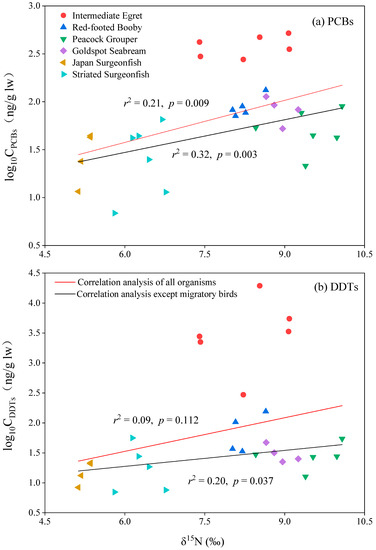 The stable isotope of nitrogen was used to illustrate the trophic level of biota. The relationships between PCBs and DDTs concentrations and δ15N values were used to investigate the biomagnification of these contaminants. Concentrations of ΣPCBs and PCB 28/31 were positively and significantly correlated with δ15N values in all six biota species (Figure 4, Figure S3). Considering that intermediate egret is a migratory bird and temporarily lives in the surrounding environment of Qilianyu Island, we also investigated the relationship between PCBs and DDTs concentrations and δ15N values in five native species. After excluding the migratory bird intermediate egret, Concentrations of ΣPCBs, ΣDDTs, PCB 28/31, PCB 52, and p,p′-DDE had significant and positive correlations with δ15N values in the five native biota species (Figure 4, Figures S3 and S4). The results suggested that PCBs and DDTs can be biomagnified in the biota species from Qilianyu Island and native species are suitable for studying the biomagnification of the contaminants.