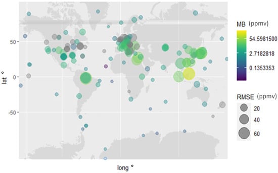 Mean bias (MB) and RMSE (in ppmv) displayed by CO2 re-analysis product provided by CAMS-EAC4 in the comparison with worldwide in situ observation considered in this study. The compliance metric for each station can be accessed through the hypergraph available at (https://rpubs.com/danilocustodio/874273).