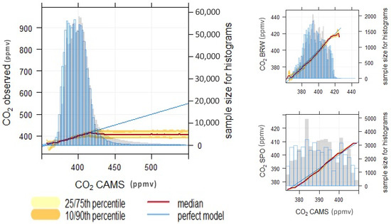 Figure 3 shows the conditional quantile plots where the re-analysis CO2 data are evaluated against the ground-based observations. The aforementioned figure illustrates the regression between re-analysis data derived from CAMS and observation at surface level for the worldwide stations described in Figure 1. The results indicate agreement among the dataset at more than 90% of the distribution. However, pronounced differences are displayed on the edges of the distribution when CAMS mainly overestimates CO2 concentrations and constrains bias above the 10/90th percentile. The CAMS data shows an increasing bias, up to 60 ppmv, at regions where potential nearby pollution sources are present. The misfit at the continental stations is probably due to the influence of CO2 fluxes close to the station, which are not spatially well resolved by the CAMS model, as is discussed in the next section.