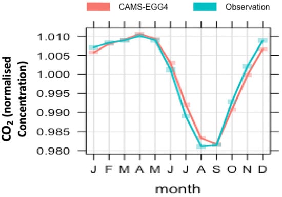 We find that the temporal profiles of CO2 from CAMS re-analysis can agree exceptionally well with the CO2 temporal variability of ground-based observation at regions with low anthropogenic flux. The CAMS analysis appears to capture the biogenic fluxes in oceanic and terrestrial regions. For instance, a maximum diurnal variation of 1 ppmv was observed for oceans and terrestrial regions with a well-mixed CO2 ratio (background regions), with maxima at noon, when observed. Chen et al. [33] reported that the biogenic CO2 surface fluxes are provided by an online biosphere model in the IFS system. In addition, biases are corrected in real time throughout the forecast.