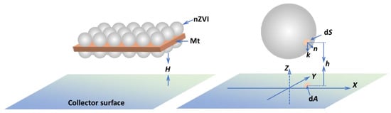 Details about calculating DLVO energies for the sphere–planar surface interaction configuration (Figure 1b) using the SEI technique can be referred to previous studies [,,,]. Briefly, the spherical nZVI particle surface was discretized into small area elements (dS). The total interaction energy was determined as a sum of the differential interaction energy between each area element dS and the planar surface []