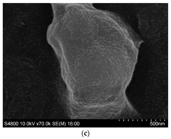 SEM images of (a) Mt, (b) nZVI particles, and (c) Mt-nZVI. The image of Mt-nZVI was taken at FZM = 0.66 g g−1.