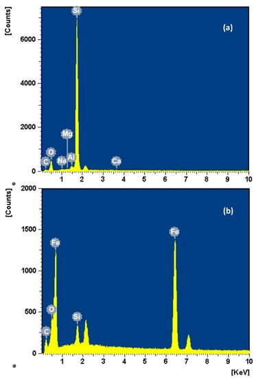 SEM with energy-dispersive X-ray spectroscopy (SEM-EDX) analysis of (a) Mt mineral and (b) Mt-nZVI heteroaggregate.