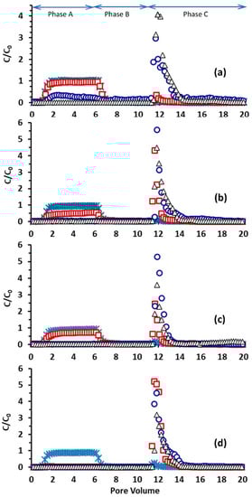 where dc is sand diameter, C and C0 are effluent and influent particle concentrations, respectively, L is column length, η0 is single collector contact efficiency determined using the expression in Ma et al. []. The values of C/C0 were obtained from breakthrough curves (BTCs) of column experiments through averaging the measurements between PVs of 1.8 and 2 [,,].