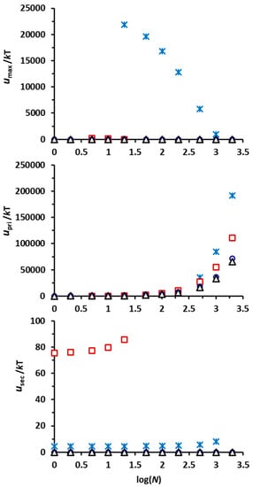 Calculated maximum energy barrier (Umax), primary minimum depth (Upri), and secondary minimum depth (Usec) for interactions between a heteroaggregate of a cuboid Mt loaded with different numbers of spherical nZVIs (N) and a planar surface at different ISs (asterisk, 0.001 M; square, 0.01 M; circle, 0.1 M; triangle, 0.2 M). The length or width of the cuboid is 1.5 μm and the height is 500 nm. The diameter of the spherical nZVIs is 20 nm.