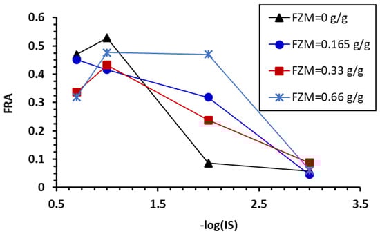 Calculated fraction of reversibly attached Mt and Mt-nZVI (FRA) as a function of solution IS at which the particles were attached in Phase A. FRA = MC/(1−MAB), where MAB and MC are the fraction of colloids recovered from Phase A and B and Phase C, respectively.