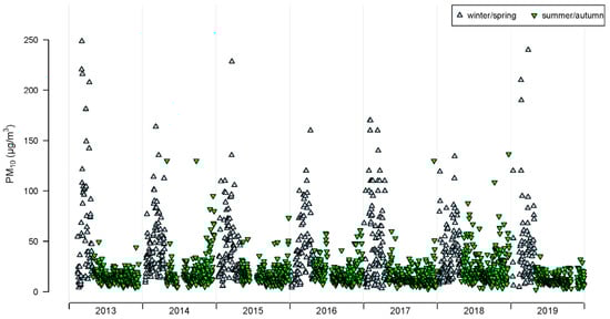 | PM10 (summer/autumn) (µg m−3) | 2.2 | 10.5 | 14.8 | 18 | 21 | 136.6 | 13 | 1483 |