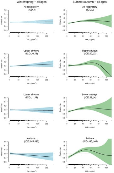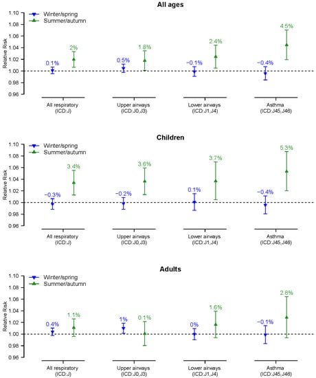 | Asthma (ICD-10: J45, J46) | Children (0–17 yr) | 0.996 [0.980–1.011] | 1.053 [1.020–1.087] |