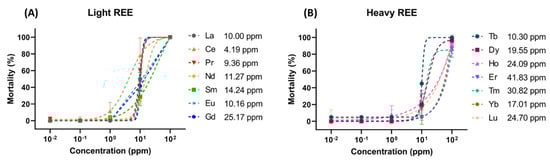 LC50 of zebrafish embryos exposed to actual concentrations (ppm) of (A) Lanthanide’s light REE and (B) Lanthanide’s heavy REE for 96 h. The 96 h LC50 values were calculated by using the sigmoid curve fitting method and the data are expressed as mean ± SEM.