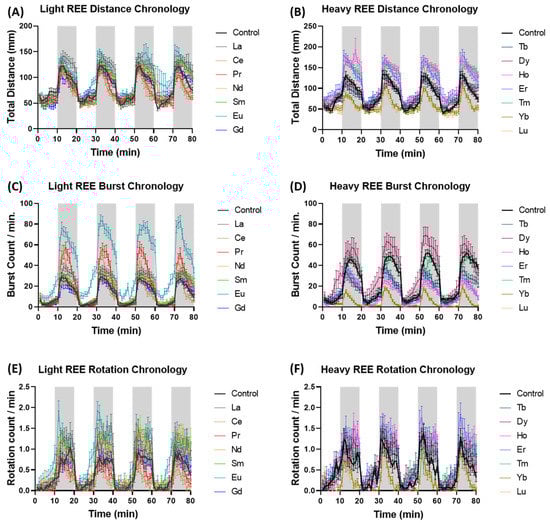 Swimming activity of zebrafish after exposure to different Lanthanides. The mean ± SEM of (A,B) distance traveled, (C,D) burst movement, and (E,F) rotation counts per minute by zebrafish larvae after 24 h exposure of 1 ppm LREE and HREE during both light and dark cycles. A two-way ANOVA test with Geisser-Greenhouse’s correction continued with Dunnett’s multiple comparisons test was carried out to compare all treatments with the control (presented in Table S2).