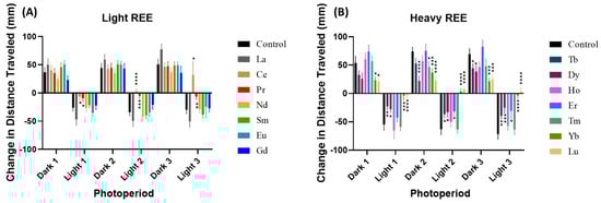The photo motor response (PMR) of zebrafish after 96 h exposure to 1 ppm of (A) light REE and (B) heavy REE. The data are expressed as mean ± SEM and statistical differences were analyzed by two-way ANOVA followed with Fisher’s LSD test (* p < 0.05, ** p < 0.01, *** p < 0.001, **** p < 0.0001).