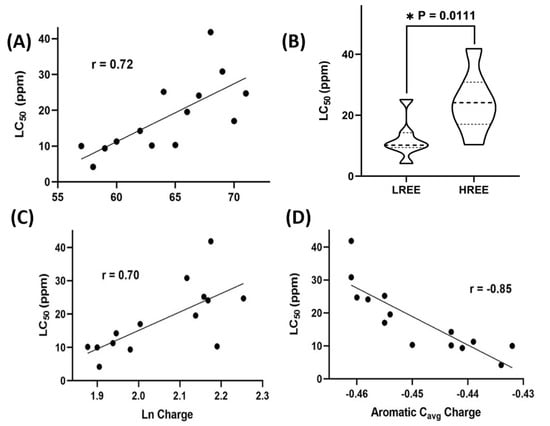 Correlations of properties of the Lanthanides complexes to the acute toxicity of fourteen Lanthanides. (A) The linear regression analysis showed a significant correlation between LC50 and Lanthanide’s atomic numbers with r = 0.72. (B) A violin plot shows a statistical difference between the two LC50 of LREE and HREE (p = 0.0111). (C) The linear regression analysis showed a significant correlation between LC50 and Lanthanide’s Milliken charge with r = 0.70. (D) The linear regression analysis showed the most significant correlation between LC50 and the aromatic Cavg charge with r = −0.85.
