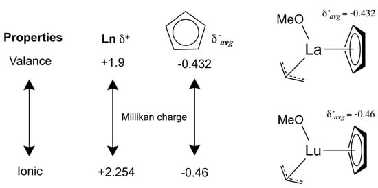 In Figure 5, we show that the property of the chelating bond of Lanthanide (III) cation to chelate aromatic ring is lying between covalent and ionic character (covalency/ ionicity). In the DFT calculation of the model Lanthanide complexes, Ln (III) can chelate Cp (cyclopentadienyl) by inducing an average Milliken charge of the carbons on the Cp ring (aromatic Cavg charge). Here, La (III) complex’s Cp is shown as an example. This aromatic Cavg charge with −0.432 e of Milliken charge will increase along with the Lanthanide series until Lu (III) complex’s Cp charge, −0.460 e, indicating that the Cp becomes more ionic. Similarly, a La (III) with +1.900 e of cation’s charge is increased along with the Lanthanide series until Lu (III) cation’s charge is +2.254 e, which indicates that Lu cation itself is the most ionic.