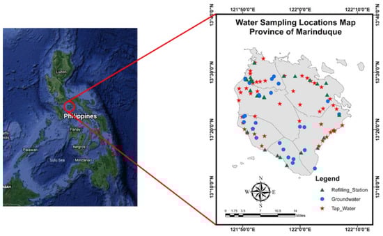The DW samples were gathered across the island province of Marinduque, Philippines, as shown in Figure 1. Marinduque is located about 200 km south of Manila, the capital city of the Philippines, covering about 96,000 hectares of land [22]. It comprises six municipalities: Boac, Buenavista, Gasan, Mogpog, Sta. Cruz, and Torrijos. It is a tropical and warm island with an annual mean temperature of 23 to 28 °C [23]. The geology of the island is characterized by permeable volcanic and sedimentary rocks, which allow groundwater to flow through across the island [14,24].