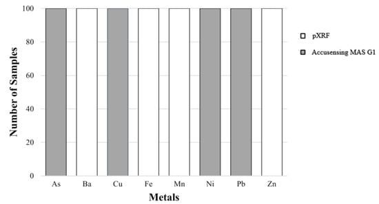 One hundred grab samples in a 500 mL volume were collected using the suggested standard procedure [25]. Twenty-five water samples from WRS, twenty-six groundwater (GW) samples, and twenty-one tap water (TW) samples were collected and placed in polyethylene (PE) bottles. All water samples were either used for drinking and/or used for cooking by households. The PE bottles were washed with distilled water or Type 1 water [26] to remove contaminants. Physicochemical parameters such as temperature, pH, total dissolved solids (TDS), and electrical conductivity (EC) were evaluated and recorded in situ using a Hannah Multiparameter HI 9811-5 portable meter [27]. The portable handheld Olympus Vanta X-ray fluorescence spectrometer and Accusensing Metals Analysis System (MAS) G1 were utilized for the HMM concentration analysis. Both analyzers are high-performance and on-site elemental analyzers that may be used with various environmental media, including water. The pXRF spectrometer was calibrated using the Olympus Vanta blank and set to Geochem mode before analysis [21]. The Accusensing MAS G1 was used for analyzing HMMs which registered “limits of detection” (LOD) in the pXRF such as As, Cu, Ni, and Pb. Figure 2 shows the metals analyzed using the two analyzers.