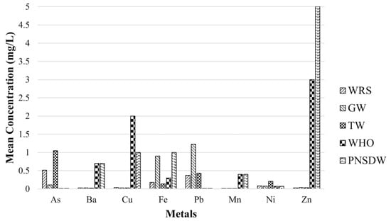 The observed HMM concentrations trend, shown in Table 7, for WRS, GW and TW were As > Pb > Fe > Ni > Cu > Zn > Ba > Mn, Pb > Fe > As > Ni > Zn > Ba > Cu > Mn, and As > Pb > Ni >Fe > Zn > Cu > Ba > Mn, respectively. It was recorded that As had the highest concentration detected in both the WRS and TW, while Mn had the lowest concentration observed in all DW sources.